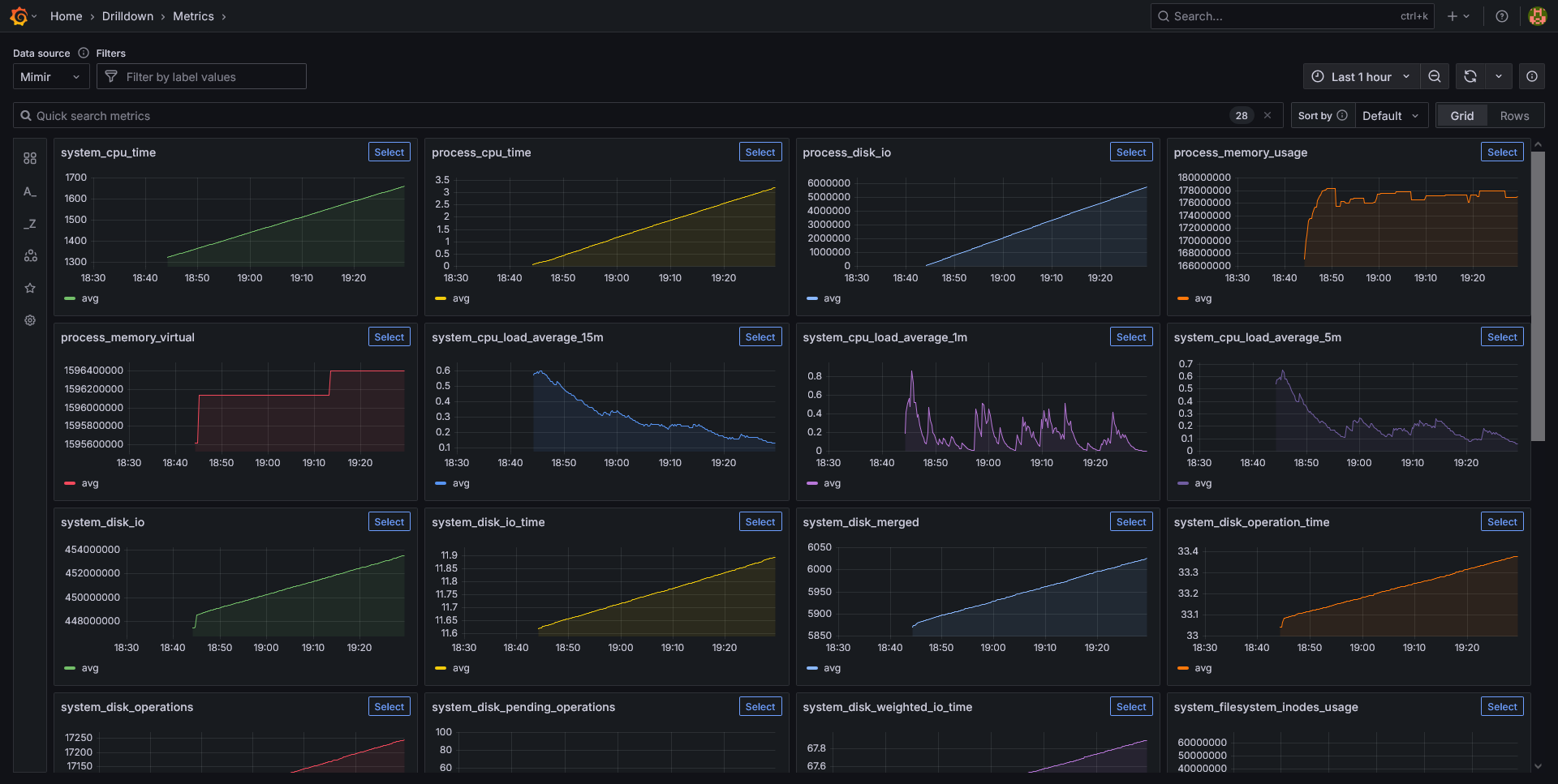 Si vamos a Home > Drilldown > Metrics deberimos poder ver las métricas de host que está recopilando el colector de otel.